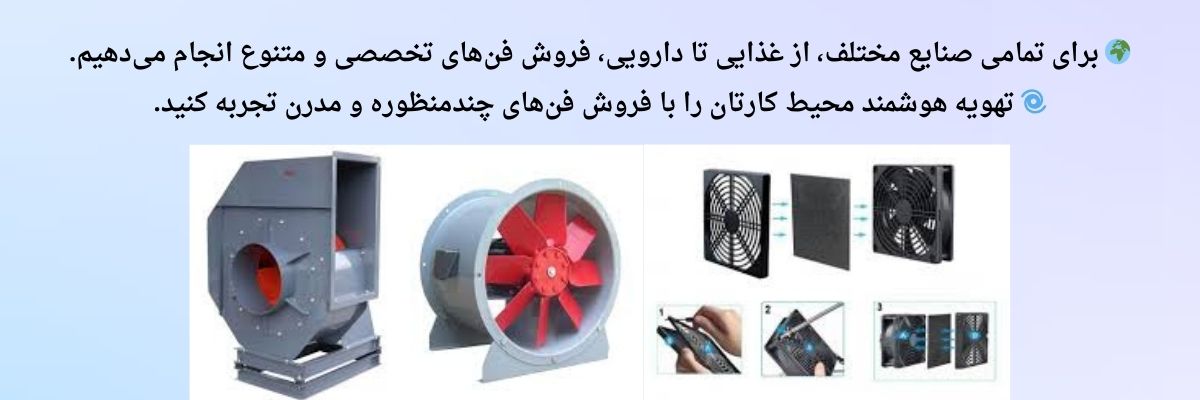 - فن صنعتی: برای کارخانهها، کارگاهها و محیطهای تولیدی استفاده میشود. این فنها توان بالایی دارند و میتوانند هوای گرم و آلوده را به سرعت خارج کنند.